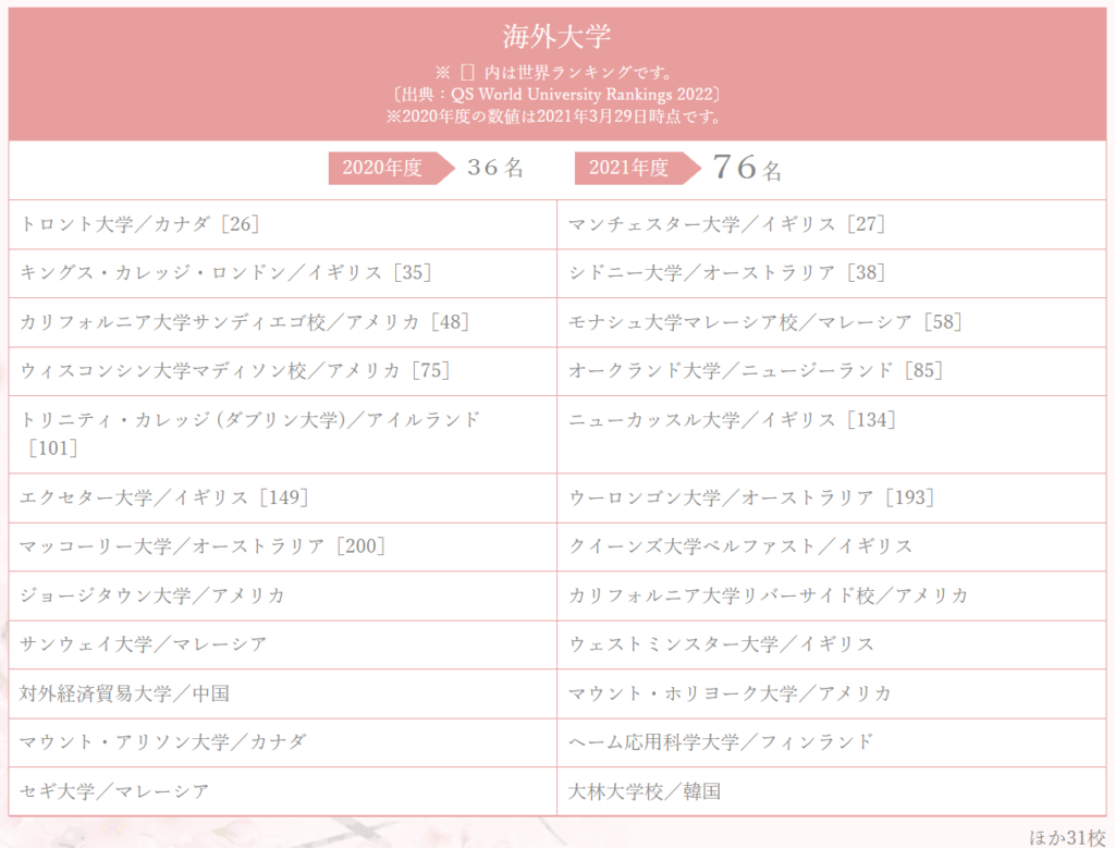 2021年度も各国の海外大学に70名以上の合格者が出ています。
