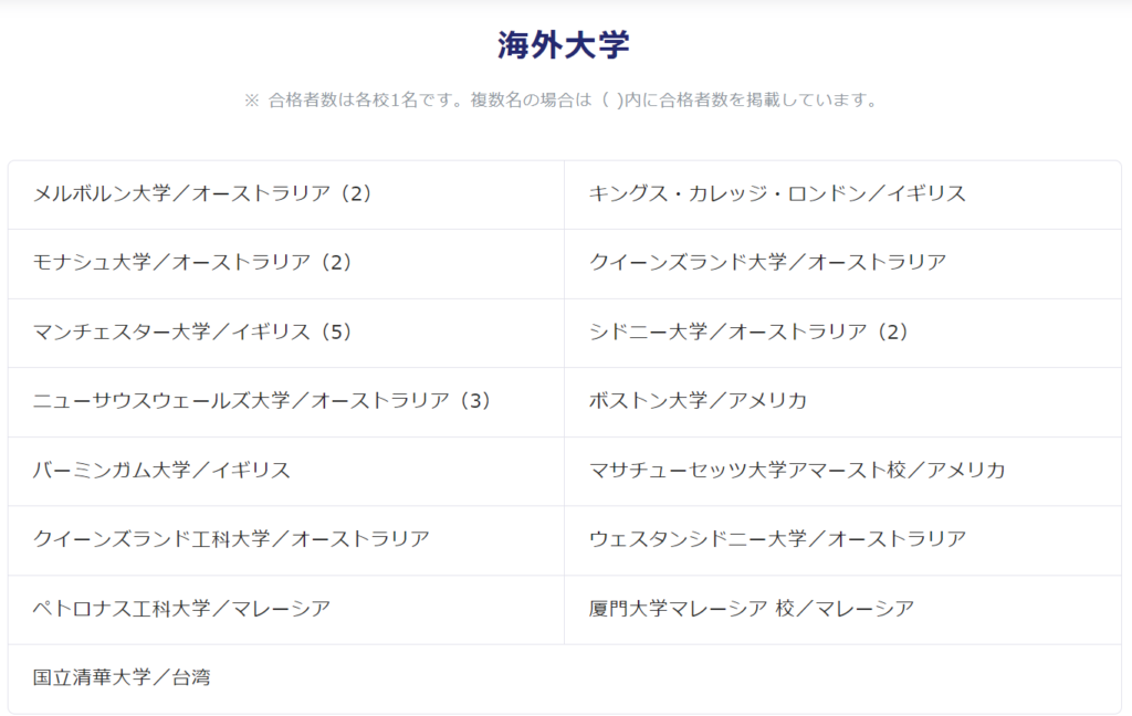 アメリカやイギリス、オーストラリア、マレーシア、台湾など世界各地の大学に合格者が出ていることが分かります。